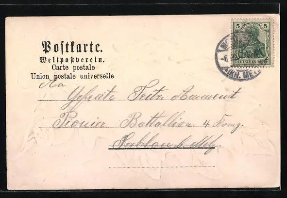Personenbezogene Daten auf der Rückseite der Karte wurden durch blauen Textmarker unkenntlich gemacht. Die blauen Stellen sind auf die Vorderseite durchgeweicht und wirken sich negativ auf das Postkartenfoto aus