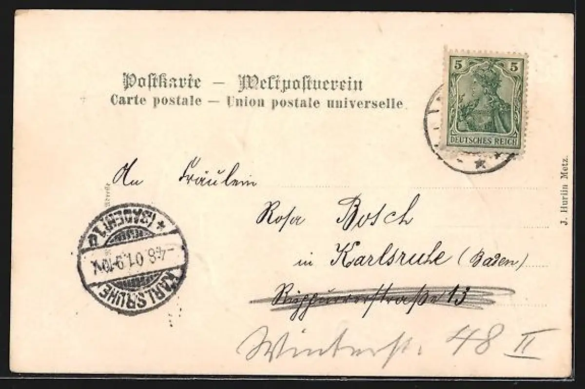 Personenbezogene Daten auf der Rückseite der Karte wurden durch blauen Textmarker unkenntlich gemacht. Die blauen Stellen sind auf die Vorderseite durchgeweicht und wirken sich negativ auf das Postkartenfoto aus