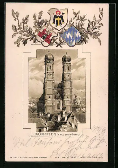Passepartout-Lithographie München, Frauenthürme mit Wappen und Münchner Kindl