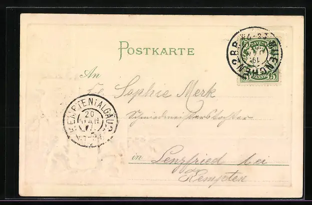 Personenbezogene Daten auf der Rückseite der Karte wurden durch blauen Textmarker unkenntlich gemacht. Die blauen Stellen sind auf die Vorderseite durchgeweicht und wirken sich negativ auf das Postkartenfoto aus