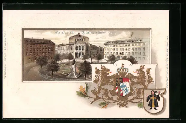 Passepartout-Lithographie München, Gärtnerplatz und Münchner Kindl, Wappen