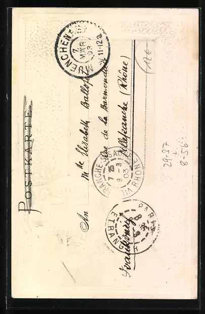 Personenbezogene Daten auf der Rückseite der Karte wurden durch blauen Textmarker unkenntlich gemacht. Die blauen Stellen sind auf die Vorderseite durchgeweicht und wirken sich negativ auf das Postkartenfoto aus