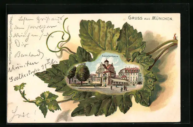 Passepartout-Lithographie München, Passanten am Künstlerhaus, Weinblatt