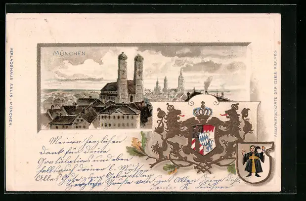 Passepartout-Lithographie München, Teilansicht mit Frauenkirche, Wappen