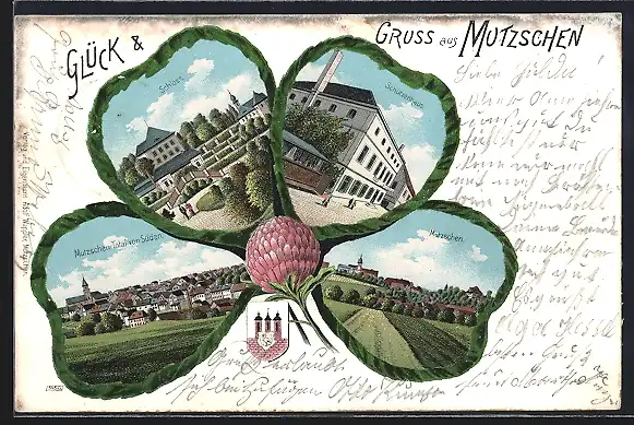 Passepartout-Lithographie Mutzschen, Totale von Süden, Schloss im Kleeblatt