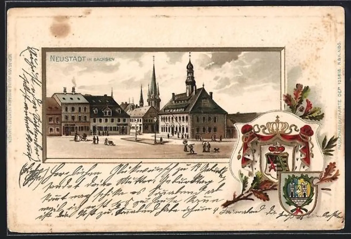 Passepartout-Lithographie Neustadt / Sachsen, Marktplatz mit Kirche, Wappen