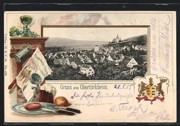 Passepartout-Lithographie Obertürkheim, Teilansicht mit Kirche, Wurst auf einem Teller, Wappen