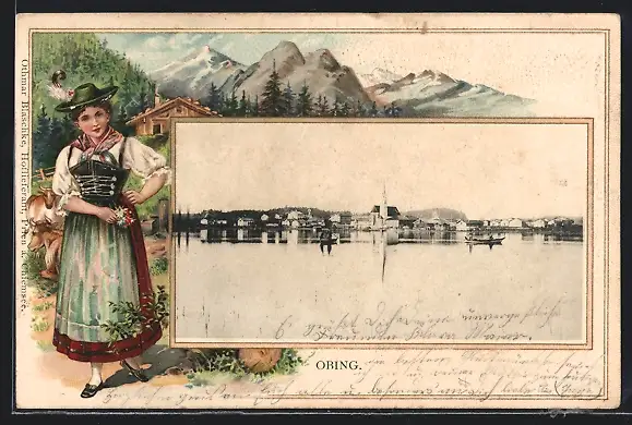 Passepartout-Lithographie Obing, Uferpartie mit Kirche, Frau in Tracht