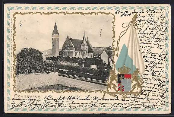 Passepartout-Lithographie Ochsenfurt a. M., Kirche mit Strassenpartie, Wappen und Fahne