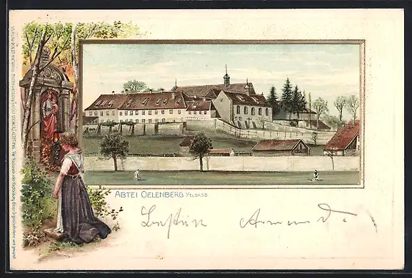Passepartout-Lithographie Oelenberg, Blick auf die Abtei Oelenberg, Frau am Flurkreuz