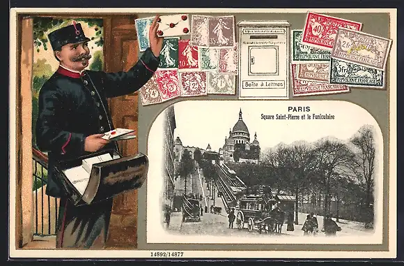 Passepartout-Lithographie Paris, Square Saint-Pierre et le Funiculaire, Postbote, Briefmarken