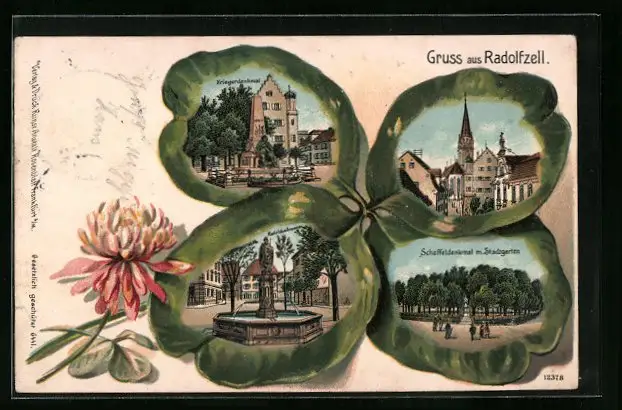 Passepartout-Lithographie Radolfzell, Ortsansichten mit Kleeblatt-Motiv