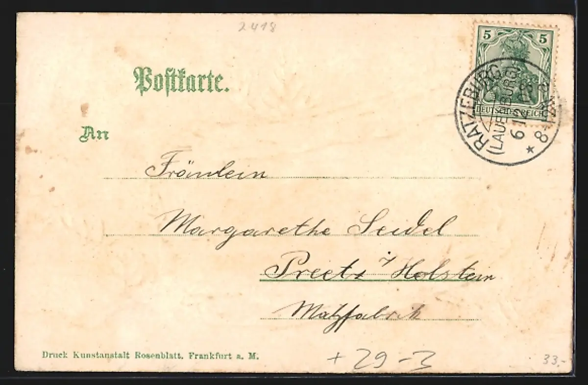 Personenbezogene Daten auf der Rückseite der Karte wurden durch blauen Textmarker unkenntlich gemacht. Die blauen Stellen sind auf die Vorderseite durchgeweicht und wirken sich negativ auf das Postkartenfoto aus