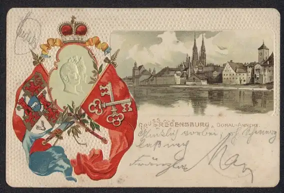 Passepartout-Lithographie Regensburg, Donau-Ansicht, Kirche, Wappen, Flaggen, Krone, geprägt