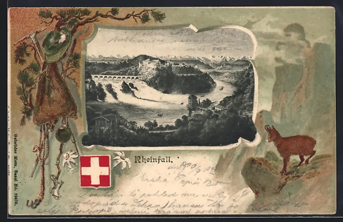 Passepartout-Lithographie Rheinfall, Ansicht der Wasserfälle aus der Vogelschau, Wanderausrüstung und Gemse