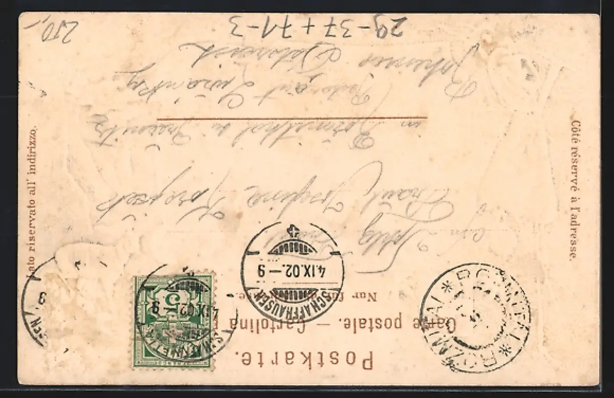 Personenbezogene Daten auf der Rückseite der Karte wurden durch blauen Textmarker unkenntlich gemacht. Die blauen Stellen sind auf die Vorderseite durchgeweicht und wirken sich negativ auf das Postkartenfoto aus