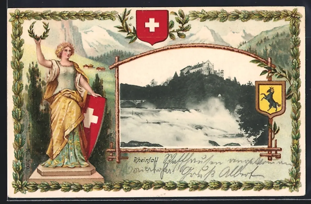 Passepartout-Lithographie Rheinfall, Ansicht des Wasserfalles mit Gebäude auf Felsen, Helvetia mit Wappen