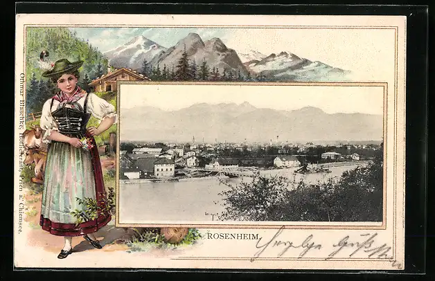 Passepartout-Lithographie Rosenheim / Bayern, Frau in Tracht, Ortsansicht