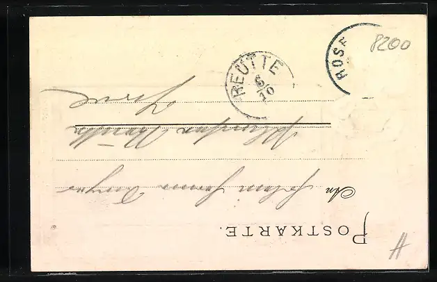 Personenbezogene Daten auf der Rückseite der Karte wurden durch blauen Textmarker unkenntlich gemacht. Die blauen Stellen sind auf die Vorderseite durchgeweicht und wirken sich negativ auf das Postkartenfoto aus