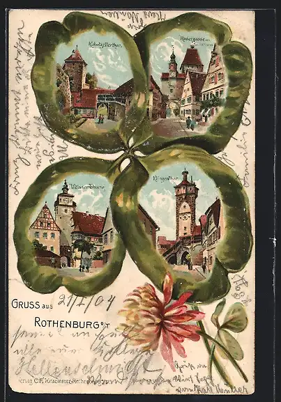 Passepartout-Lithographie Rothenburg / Tauber, Kobolzellerthor, Rodergasse, Weisserthurm & Klingenthor im Kleeblatt