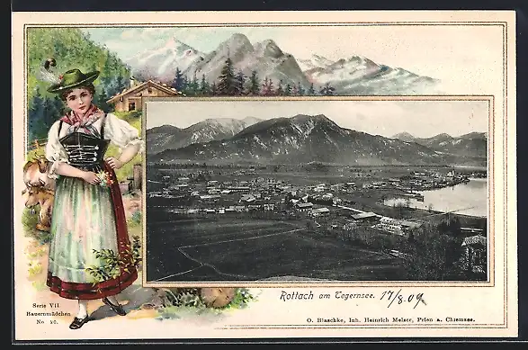Passepartout-Lithographie Rottach am Tegernsee, Teilansicht mit Bergen, Frau in Tracht