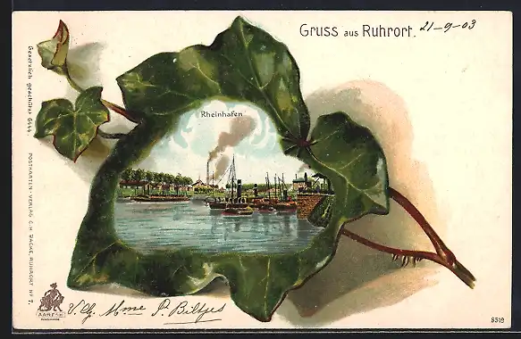 Passepartout-Lithographie Ruhrort, Rheinhafen im Weinblatt