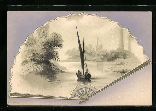 Passepartout-Lithographie Segelboot auf einem See in einem Fächer dargestellt