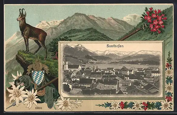 Passepartout-Lithographie Sonthofen, Teilansicht, Gams auf einem Felsen
