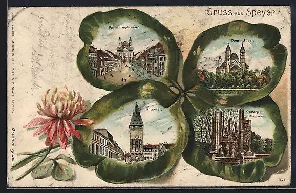 Passepartout-Lithographie Speyer, Dom & Hauptstrasse, Altpörtel, Oelberg im Domgarten