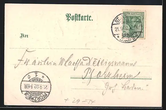 Personenbezogene Daten auf der Rückseite der Karte wurden durch blauen Textmarker unkenntlich gemacht. Die blauen Stellen sind auf die Vorderseite durchgeweicht und wirken sich negativ auf das Postkartenfoto aus