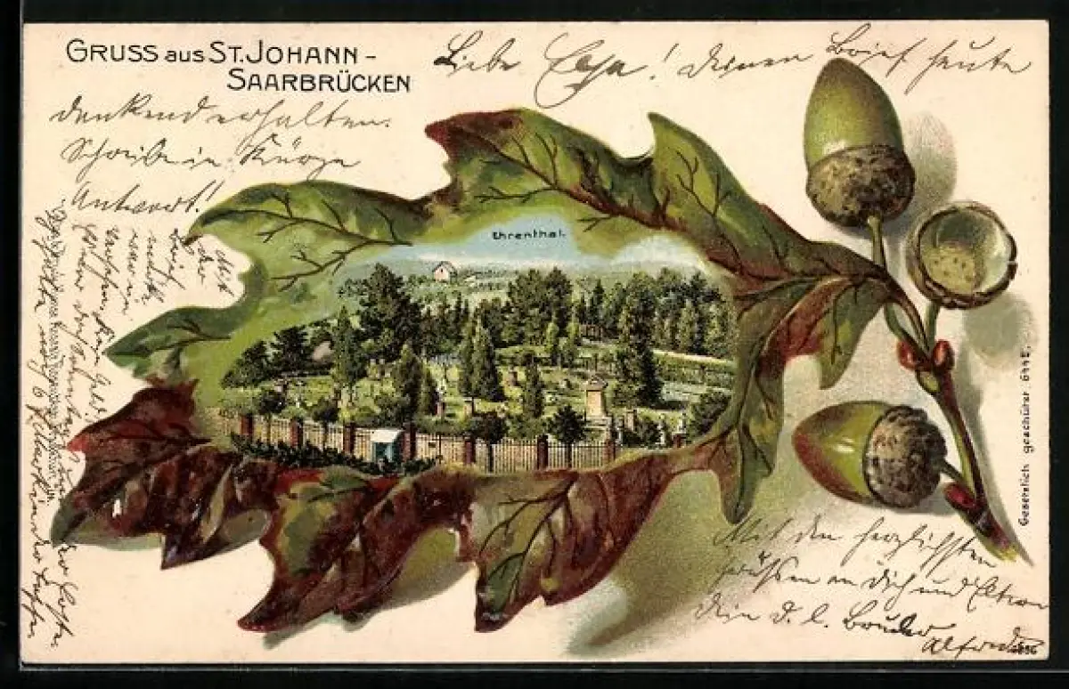 Passepartout-Lithographie St. Johann-Saarbrücken, Blick in das Ehrental, Eichenblatt mit Eicheln