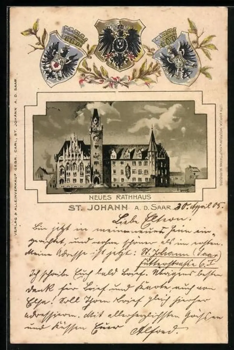 Passepartout-Lithographie St. Johann a. d. Saar, Neues Rathaus, Wappen