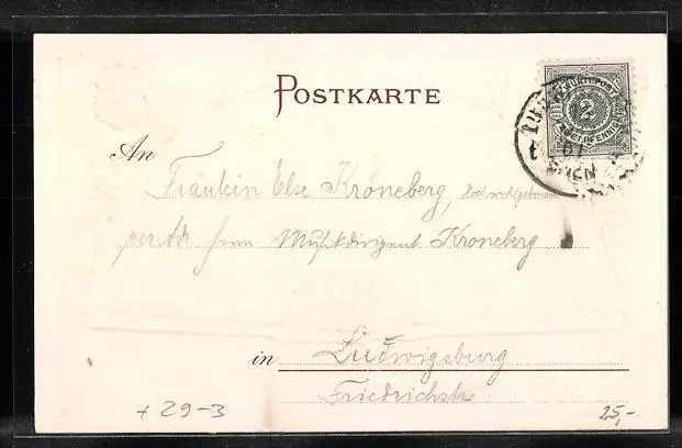 Personenbezogene Daten auf der Rückseite der Karte wurden durch blauen Textmarker unkenntlich gemacht. Die blauen Stellen sind auf die Vorderseite durchgeweicht und wirken sich negativ auf das Postkartenfoto aus