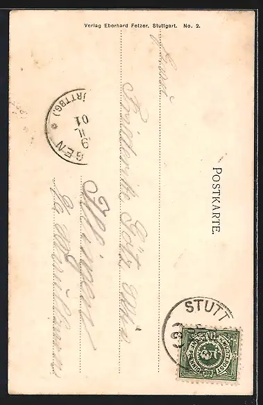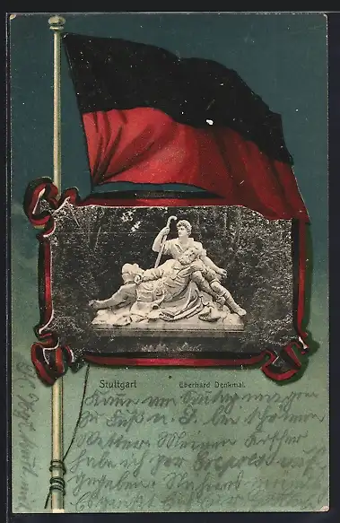 Passepartout-Lithographie Stuttgart, Blick auf das Eberhard-Denkmal, Gehisste Fahne
