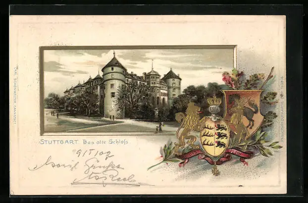 Passepartout-Lithographie Stuttgart, Das alte Schloss, Wappen