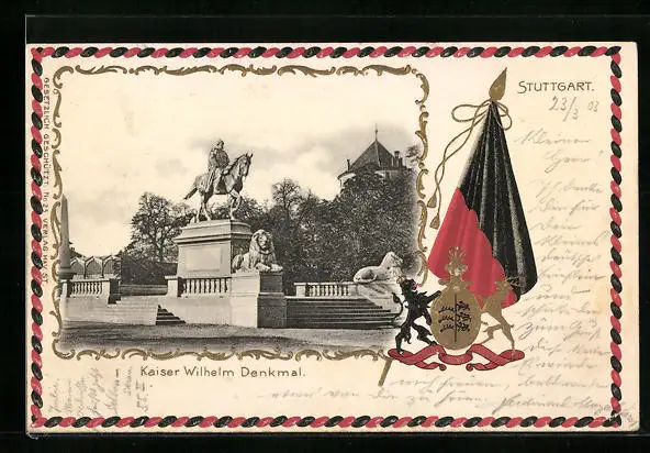Passepartout-Lithographie Stuttgart, Kaiser Wilhelm Denkmal mit geprägtem Wappen