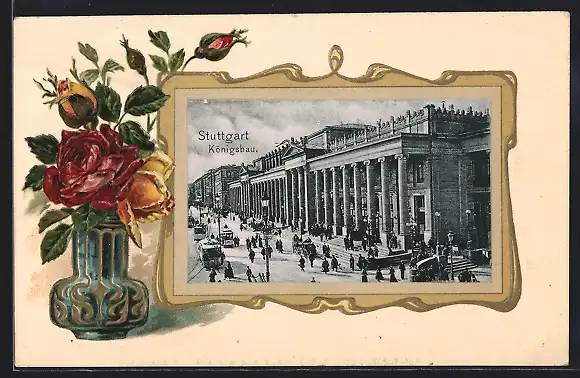 Passepartout-Lithographie Stuttgart, Königsbau mit Strassenbahnen