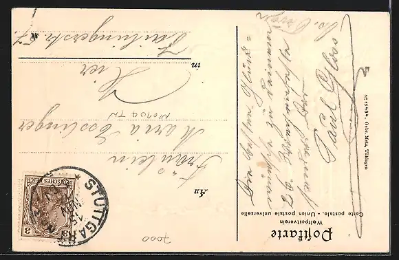 Personenbezogene Daten auf der Rückseite der Karte wurden durch blauen Textmarker unkenntlich gemacht. Die blauen Stellen sind auf die Vorderseite durchgeweicht und wirken sich negativ auf das Postkartenfoto aus