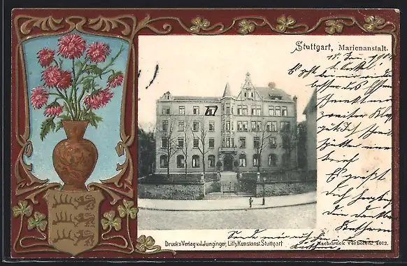 Passepartout-Lithographie Stuttgart, Marienanstalt, Vase mit Blumen, Wappen