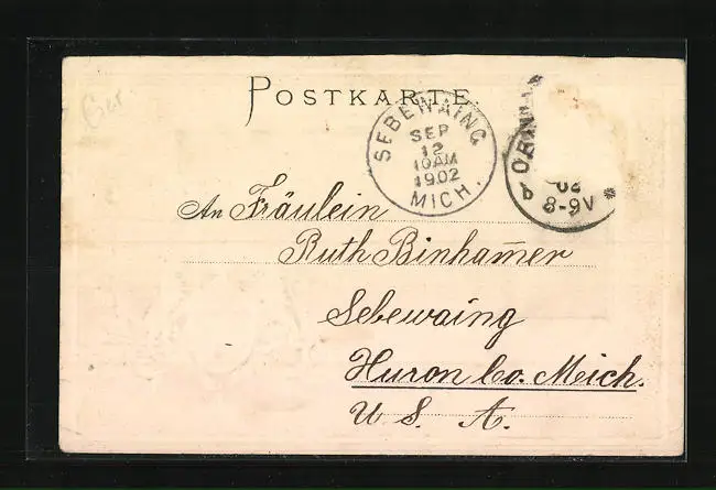 Personenbezogene Daten auf der Rückseite der Karte wurden durch blauen Textmarker unkenntlich gemacht. Die blauen Stellen sind auf die Vorderseite durchgeweicht und wirken sich negativ auf das Postkartenfoto aus