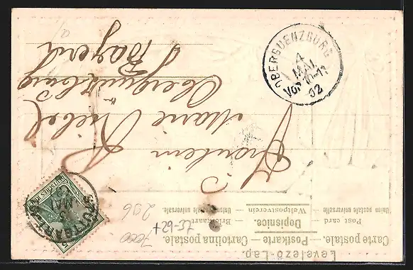 Personenbezogene Daten auf der Rückseite der Karte wurden durch blauen Textmarker unkenntlich gemacht. Die blauen Stellen sind auf die Vorderseite durchgeweicht und wirken sich negativ auf das Postkartenfoto aus