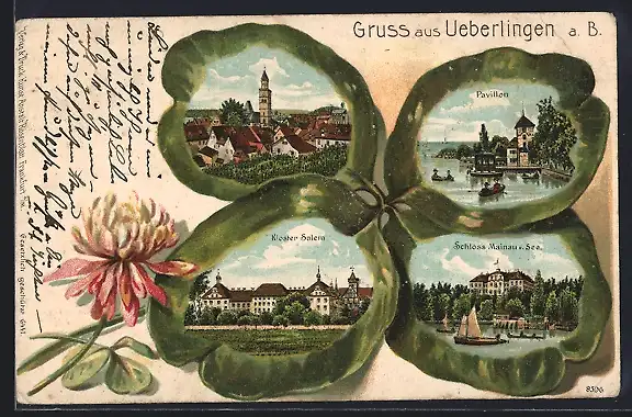 Passepartout-Lithographie Ueberlingen / Bodensee, Kloster Salem, Schloss Mainau u. See und Pavillon im Kleeblatt