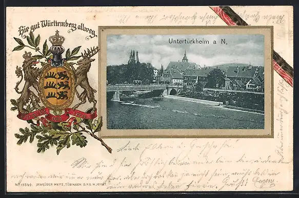 Passepartout-Lithographie Untertürkheim a. N., Teilansicht mit Brücke, Wappen von Württemberg