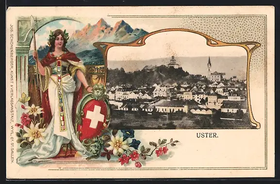 Passepartout-Lithographie Uster, Ortsansicht aus der Vogelschau, Helvetia mit Wappenschild