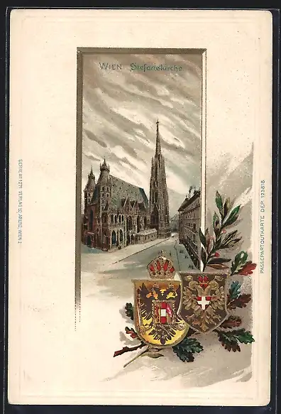 Passepartout-Lithographie Wien, Ansicht der Stefanskirche, Wappen