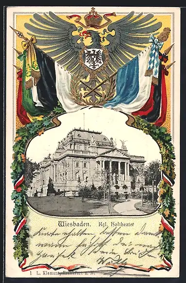 Passepartout-Lithographie Wiesbaden, Kgl. Hoftheater mit Anlage, Flaggen, Reichswappen, Eichenkranz