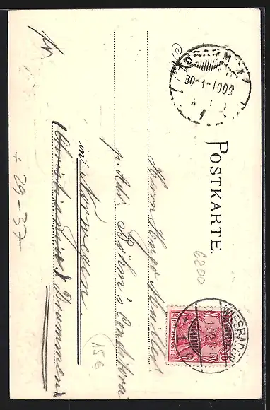 Personenbezogene Daten auf der Rückseite der Karte wurden durch blauen Textmarker unkenntlich gemacht. Die blauen Stellen sind auf die Vorderseite durchgeweicht und wirken sich negativ auf das Postkartenfoto aus