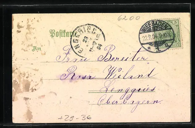 Personenbezogene Daten auf der Rückseite der Karte wurden durch blauen Textmarker unkenntlich gemacht. Die blauen Stellen sind auf die Vorderseite durchgeweicht und wirken sich negativ auf das Postkartenfoto aus