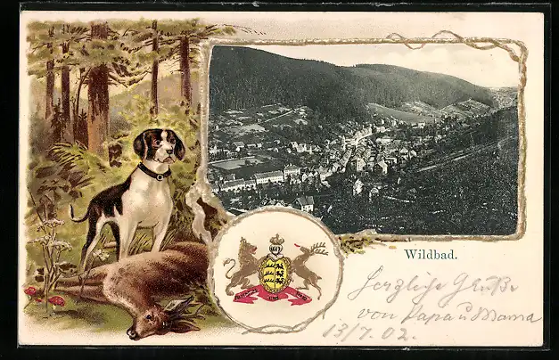 Passepartout-Lithographie Wildbad / Enz, Ortsansicht aus der Vogelschau, Wappen