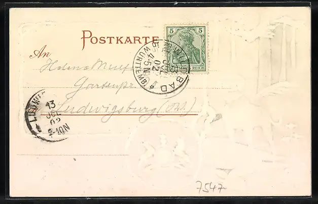 Personenbezogene Daten auf der Rückseite der Karte wurden durch blauen Textmarker unkenntlich gemacht. Die blauen Stellen sind auf die Vorderseite durchgeweicht und wirken sich negativ auf das Postkartenfoto aus